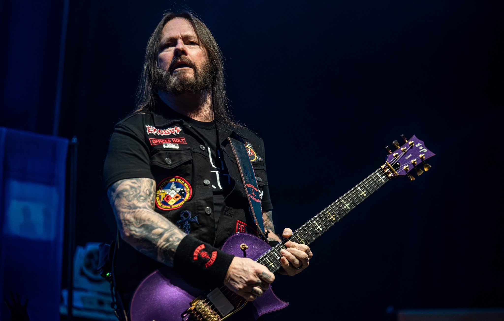 bénéficie d’entrée de jeu d’une belle ambiance. Ce concert nous permet de retrouver Rob Dukes au chant, avec l’espoir d’effacer la prestation de ses compères non loin de là, en 2016, à la Kufa. Gare cependant à la chute ! Rob s’en amuse, et Gary Holt (arborant un joli patch Slayer) attire de toute façon tous les regards. Sans oublier le gros son de basse de Jack Gibson (Deathamphetamine) ! L’intro mélodique de Blacklist fait son petit effet, mais Dukes réclame à plusieurs reprises de nous entendre davantage. On est venu de Californie pour vous Teach you a lesson in violence, annonce-t-il avant de demander plus tard si nous méritons The Toxic Waltz… d'ailleurs introduit malicieusement par le riff de Raining Blood. Strike of the Beast achève enfin ce concert certes meilleur que prévu sans s'avérer transcendant.