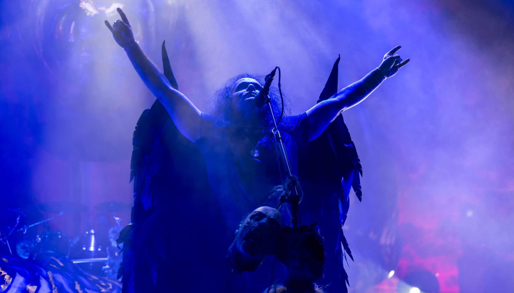 Attention cependant aux lights aveuglantes, notamment sur People of the Lie, à tel point qu’on se dit que bientôt il faudra se protéger les yeux au même titre que les oreilles en concert ! A noter que Mille sait laisser de la place à ses compères Sami et Frédéric aux guitares, et nous réclame ensuite du crowd surf pour Betrayer, avant de rencontrer quelques difficultés au chant pour Krushers of the World. Comment vous sentez-vous demande-t-il à ses Hordes of Chaos, pour la chanson du même nom, toujours fédératrice. Après avoir arboré des ailes pour Loyal to the Grave (pas leur meilleure cependant), il accueille Britta Gortz (de Hiraes) en renfort sur Tränenpalast pour un rendu plutôt cool.